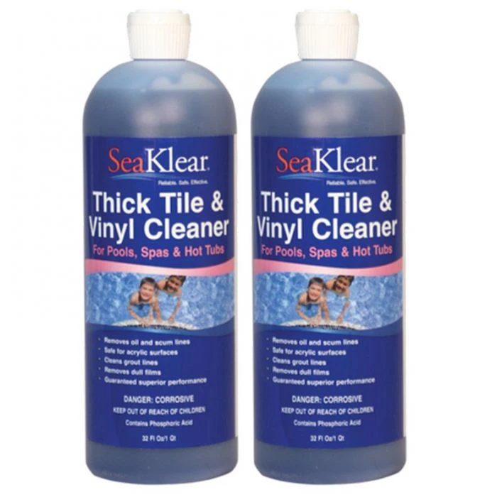 SeaKlear Thick Tile & Vinyl Cleaner breaks down and removes scale, film, oil and scum lines from the toughest of spots! Thick Tile & Vinyl Cleaner is nonabrasive – it reaches down into pores to remove soils. This product can also be used on acrylic surfaces. It helps to remove stubborn scale and dull films at the waterline of the pool or spa.